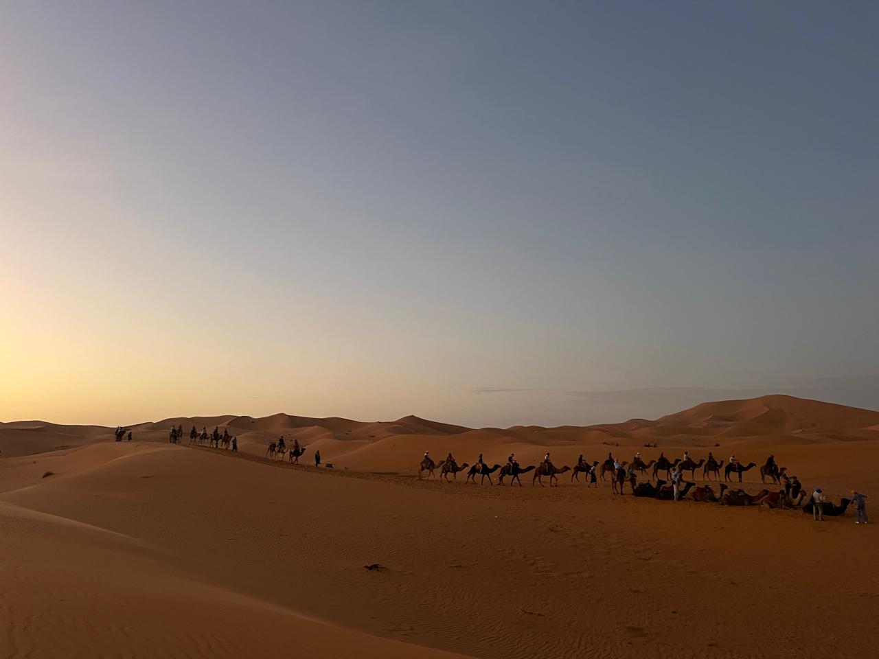 After breakfast, continue your journey south through the ever-changing landscapes of the Draa Valley. Pass through Zagora, a historic desert trading town famous for its sign indicating "Timbuktu 52 days" – a reminder of the ancient caravan routes that once connected Morocco to West Africa. Stop to explore the local markets and palm groves before continuing to M'Hamid El Ghizlane, the last village before the vast Sahara desert begins. Here, the paved road ends and your true desert adventure begins as you switch to off-road tracks. Your experienced driver navigates through rocky plateaus and sandy terrain toward Erg Chegaga, Morocco's largest and most remote dune field. Unlike the more touristy Erg Chebbi, Chegaga offers a wilder, more authentic desert experience with dunes reaching up to 300 meters high. Upon arrival, you'll be greeted by your camel guides for a magical sunset camel trek across the golden sands. Watch as the setting sun paints the dunes in shades of orange and red – a truly unforgettable moment. Return to your desert camp for a delicious dinner prepared by nomadic cooks, followed by traditional Berber music and drumming around the campfire under the brilliant Saharan night sky. Overnight in comfortable nomadic-style tents.